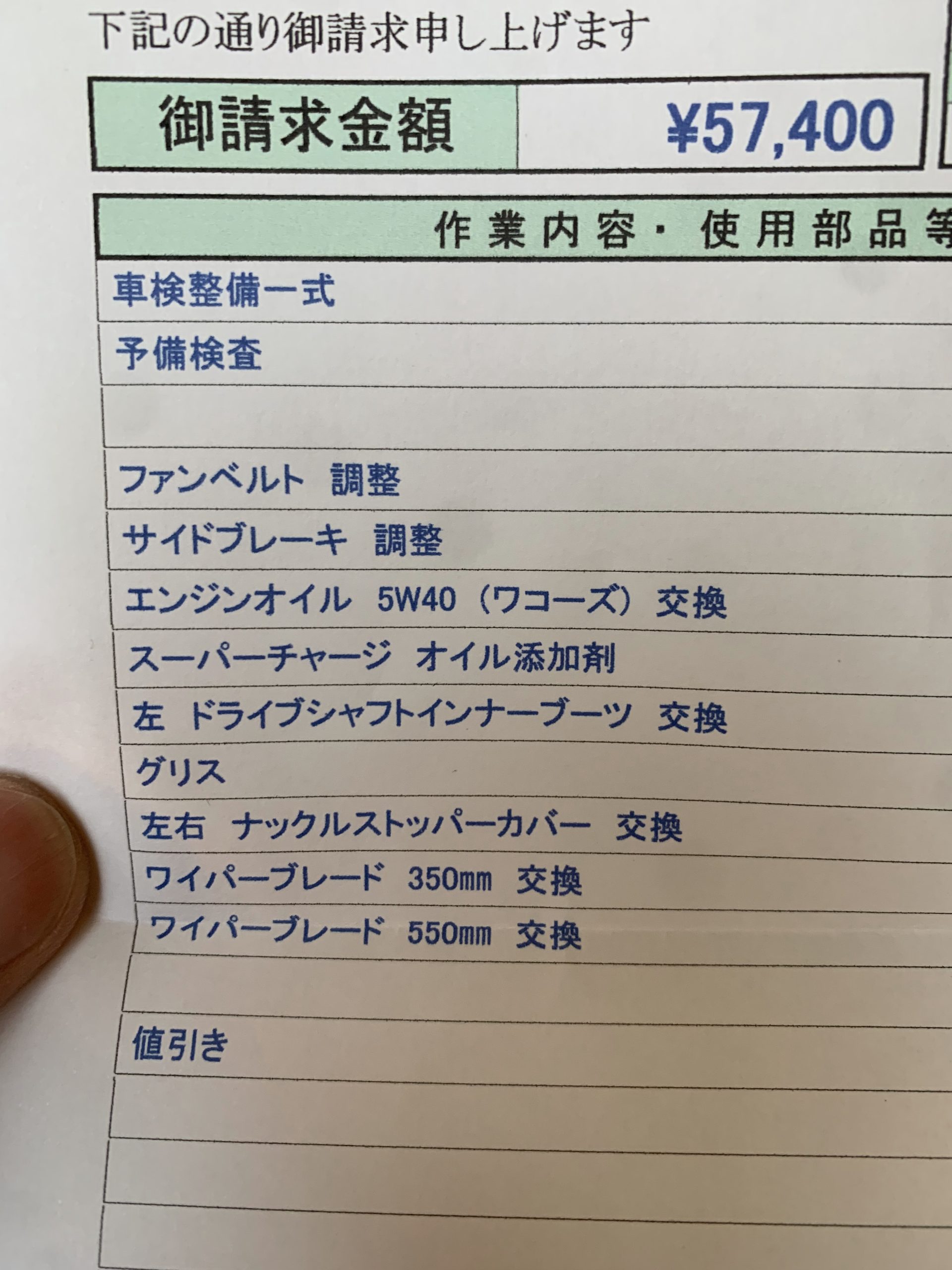 前回はちょこちょこ修理箇所があって、総額14万円ほどかかったので、今回もそれくらいかなと思っていたのですが、今回は左側のドライブシャフトインナーブーツが交換になっただけで、整備代は57,400円で済みました!!