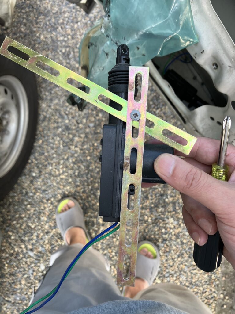 取付け方は、ドアパネルを外し、鍵のレバーの下あたりにモーター(アクチュエーター)をネジ止めし、鍵のレバーから出ている鉄の棒とアクチュエーターをロッド(金属の棒)を上手く曲げて繋いで、レバーをアクチュエーターで上下させるのですが、この調整がメチャクチャ大変でした。