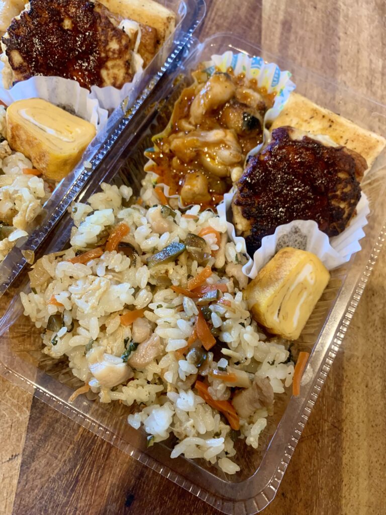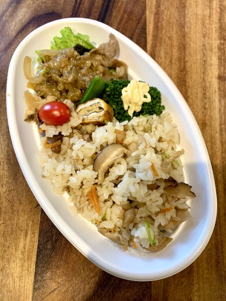 お妻弁当と娘弁当とジジババ弁当で4人前の日は、肉野菜炒めや混ぜご飯などそれぞれ少しの材料で多く作れる料理や、豆腐でカサ増ししたハンバーグなど、節約するようにしています。