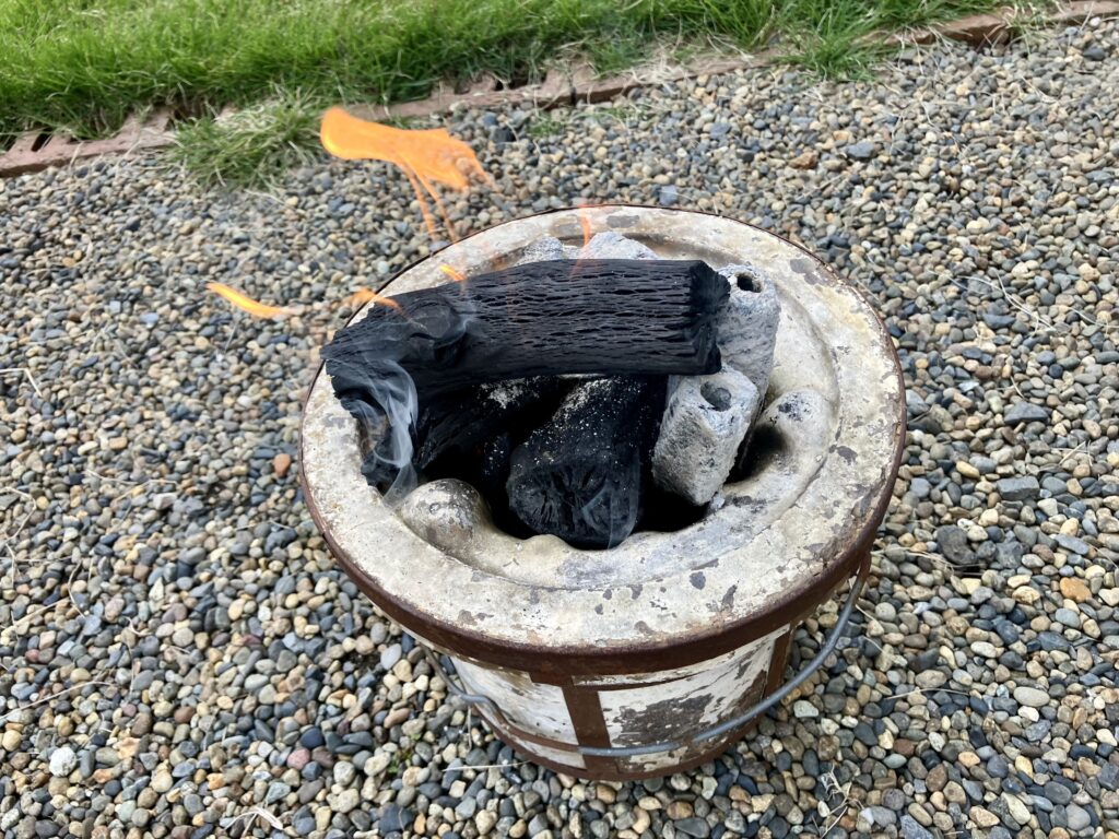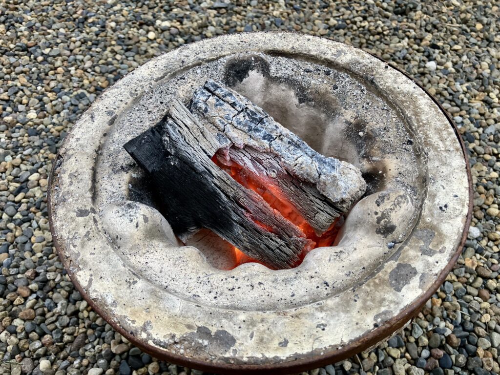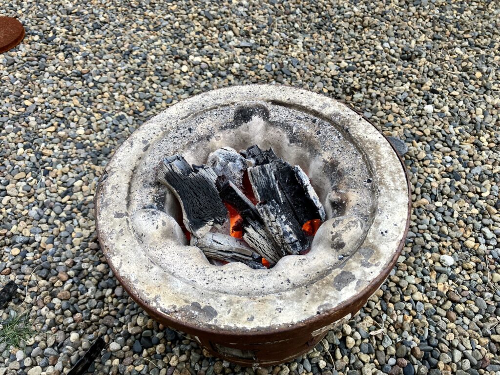 今年の夏、愛犬りんた氏の犬友のおねえさまから火鉢と一緒に炭をいただいたのですが、やはり使うことなくバイクシェルターの肥やしになっていました。