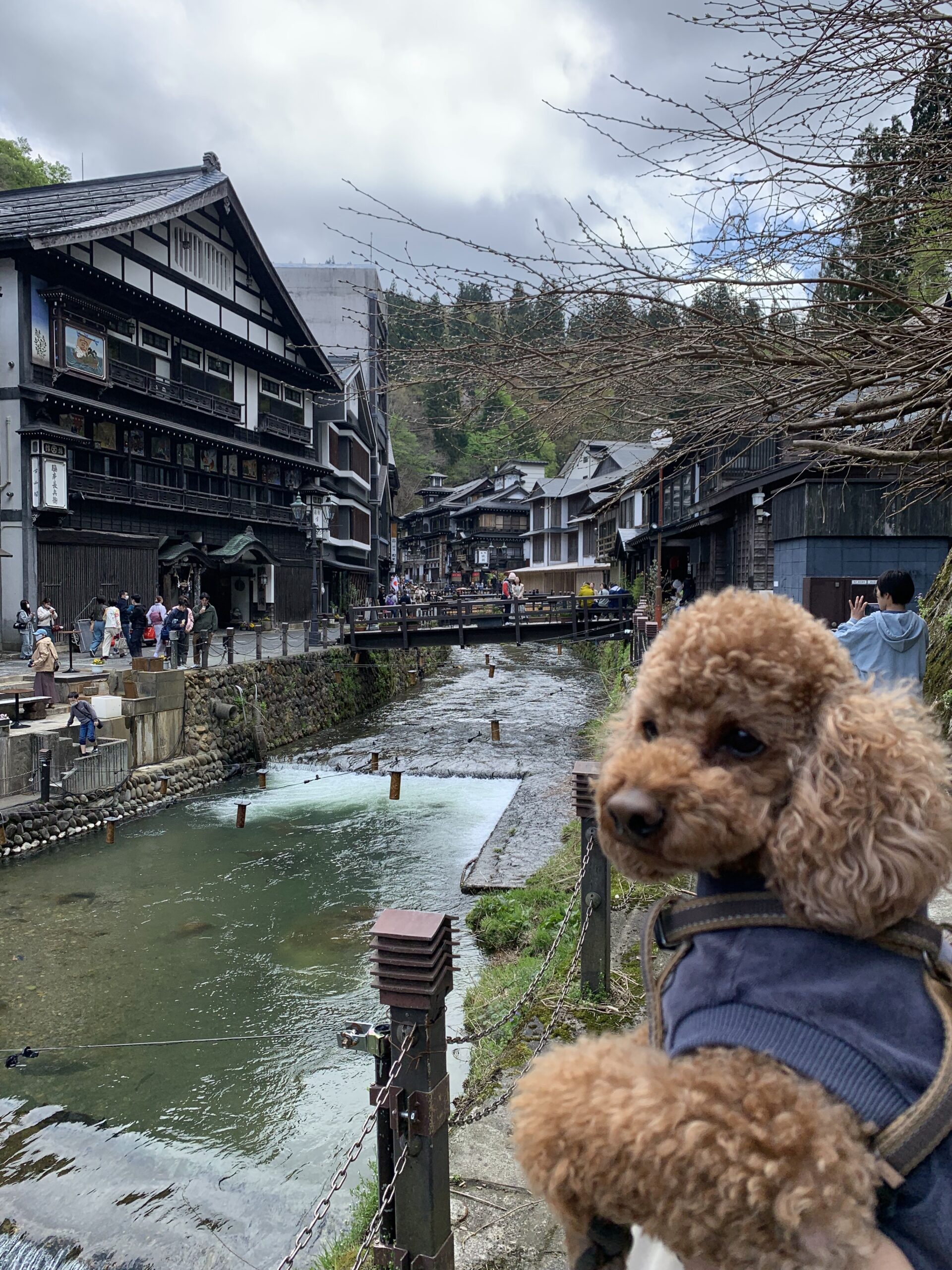 銀山温泉は宿泊客以外、直接、車で行くことは出来ないため、1.6km手前の大正ろまん館からシャトルバスに乗るのですが、りんた氏はキャリーバッグに入れても乗車不可なので、私達は1.6km歩くことにしました。