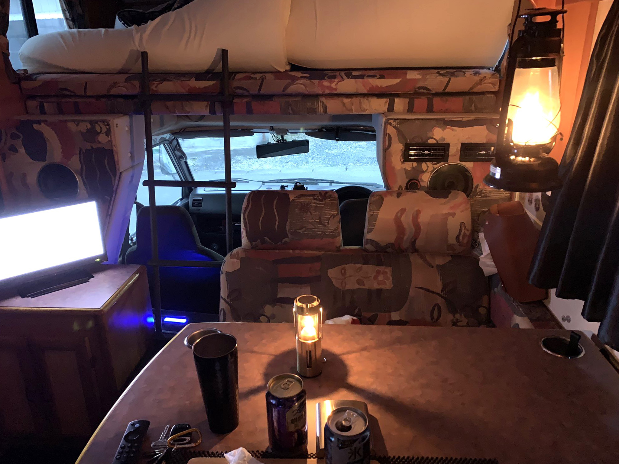 私は自宅が仕事場なので仕事終わりはキャンピングカーで一杯やるのがリラックスタイムで、最近はオイルランタンの明かりで過ごすのがマイブームです。